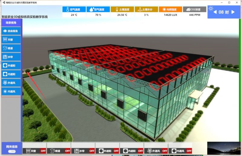 該平臺通過3D技術(shù)進行智能農(nóng)業(yè)大棚的虛擬仿真。系統(tǒng)提供溫濕度、水分、光照等參數(shù)的監(jiān)測和遮陽簾、排風(fēng)扇、灌溉系統(tǒng)的自動控制功能。通過控制策略的設(shè)定,可模擬如何讓作物獲得最佳的生長環(huán)境。通過該系統(tǒng)學(xué)生可熟悉傳感器的使用、WSN應(yīng)用程序的開發(fā)。